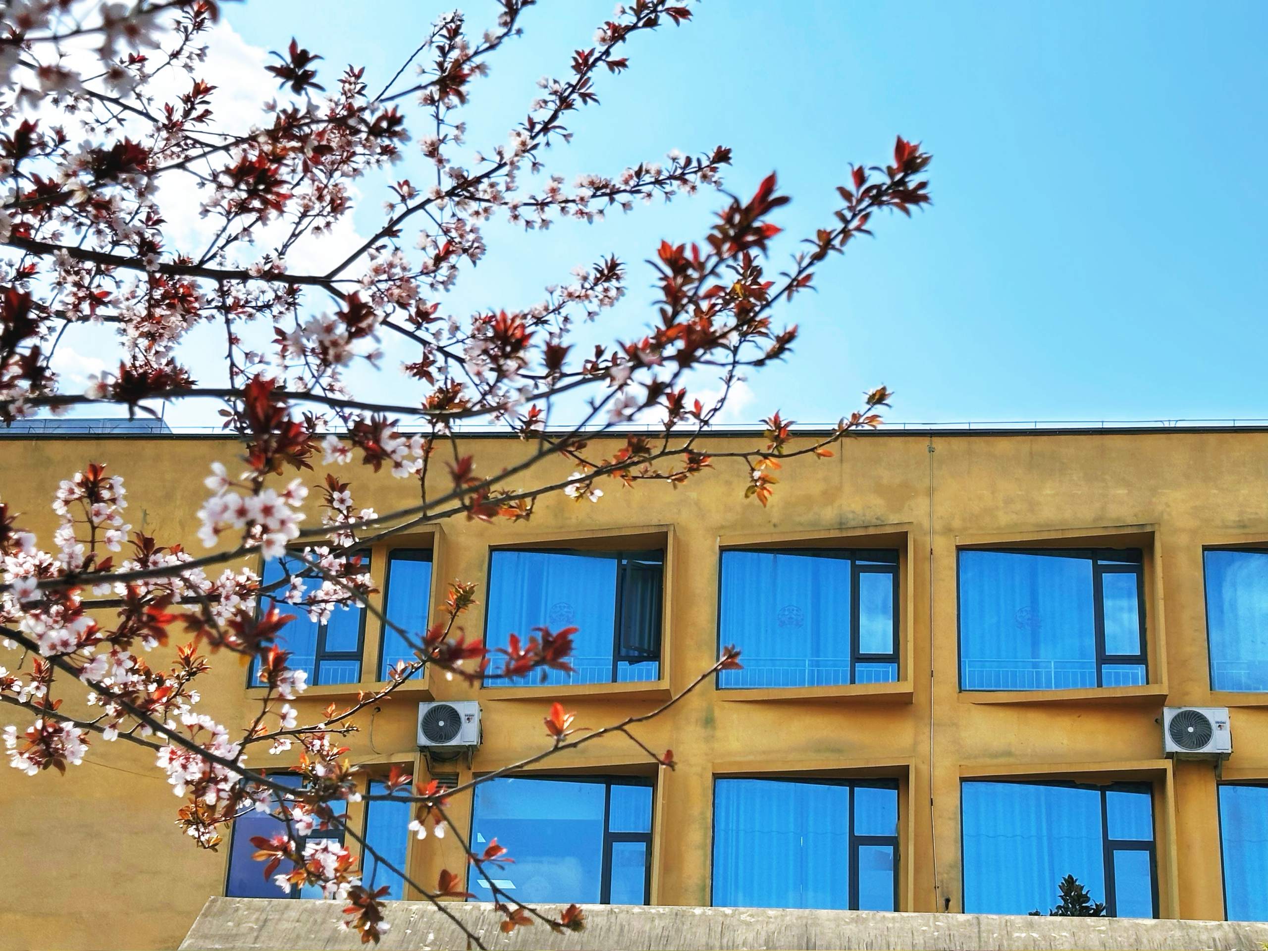 澄澈藍天下,柔美的花影攀上硬朗的建筑線條,讓春日的溫柔與現代空間的質感在此刻交織。嚴謹的醫療空間,因這一樹繁花而變得親切可人。