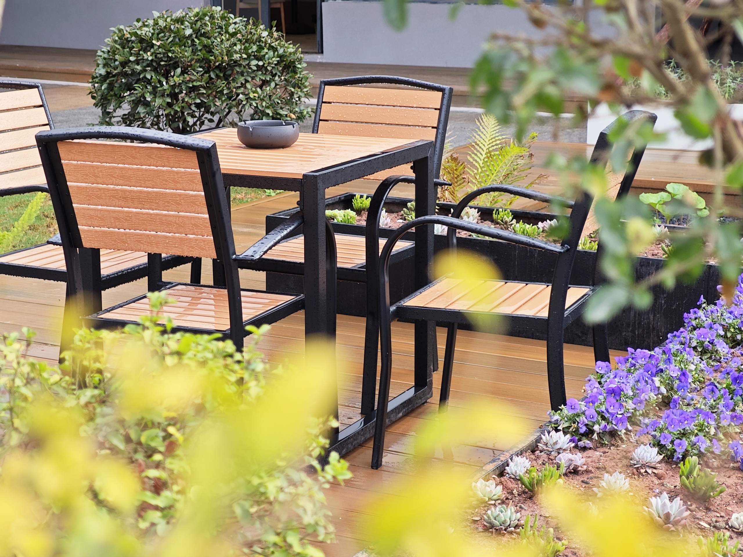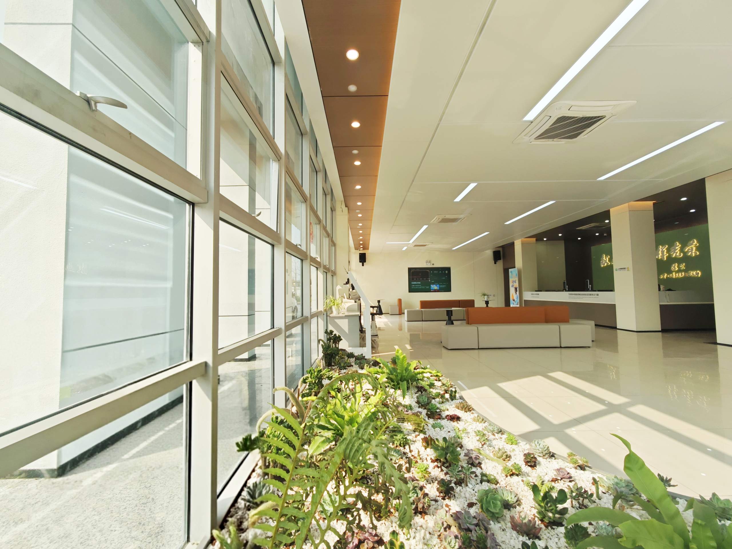 實木走廊旁,綠植抽芽,繁花點點,木質桌椅靜候著片刻休憩;步入大廳,多肉與蕨類在透過玻璃窗的春光里蓬勃生長,陽光在光潔的地面投下斑駁光影。