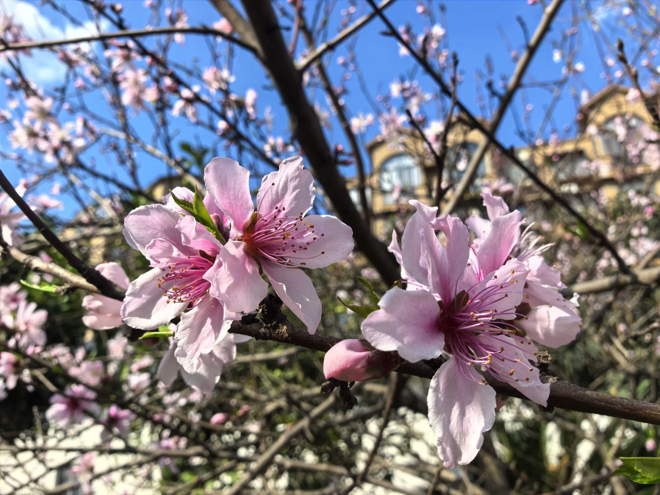 粉白色的紅葉李從畫面左側舒展而出,與漿站暖黃色的樓宇相映成趣。