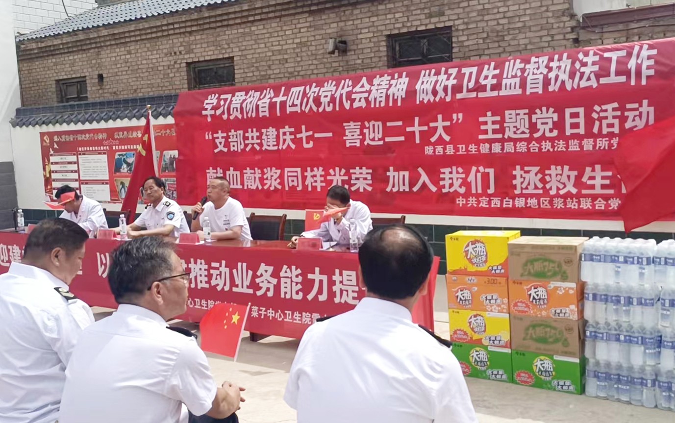 隴西縣衛生健康局綜合執法監督所黨支部、定西白銀地區漿站聯合黨支部、菜子中心衛生院黨支部和菜子中心衛生院雪山分院黨支部,聯合開展“支部共建,慶七一,喜迎二十大”主題黨日活動。定西白銀地區漿站聯合黨支部書記任紅衛同志做了關于“獻血漿、送溫暖,筑牢疫情防控防線”專題報告,為感謝所有醫務人員在抗擊疫情中的辛勤付出,特意為他們送上消暑慰問品。